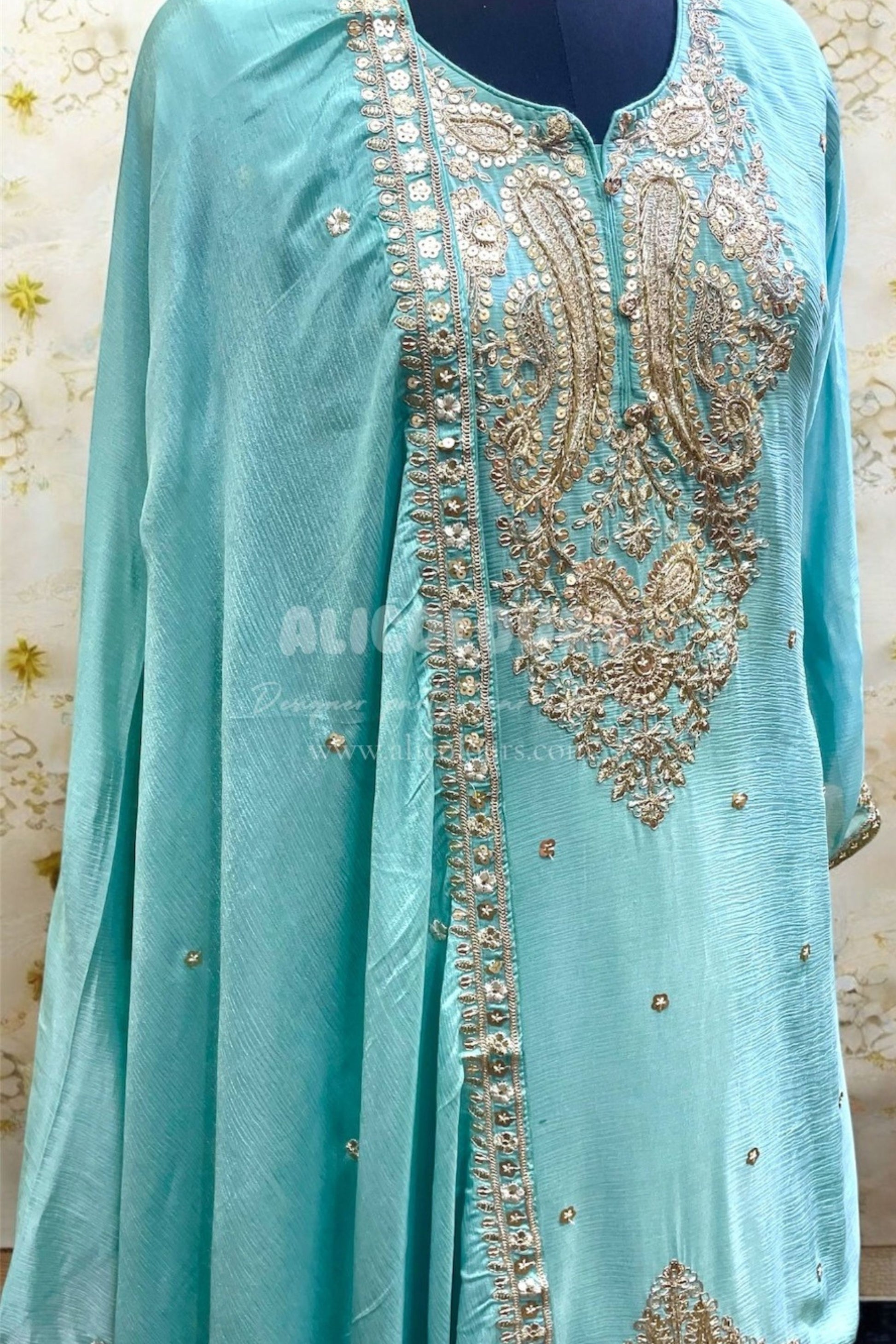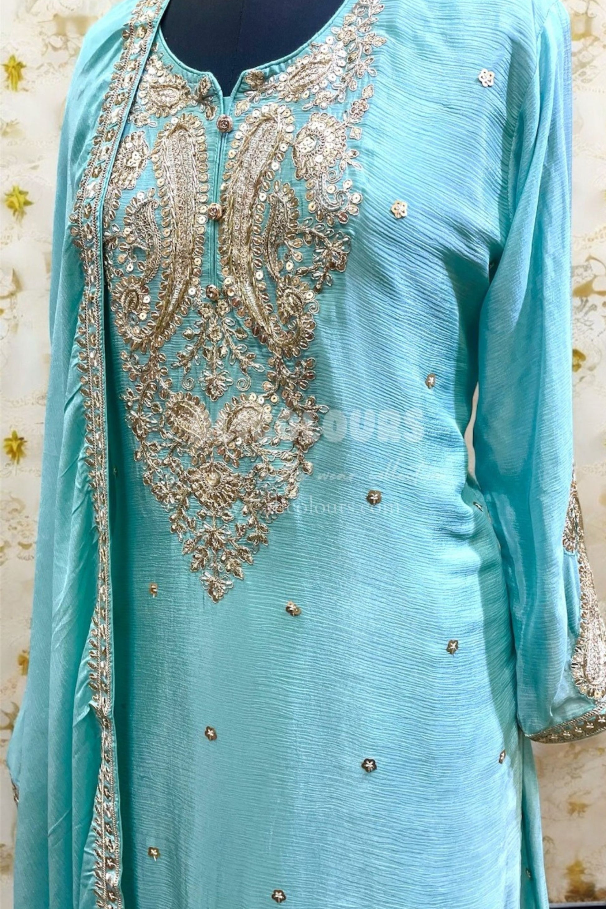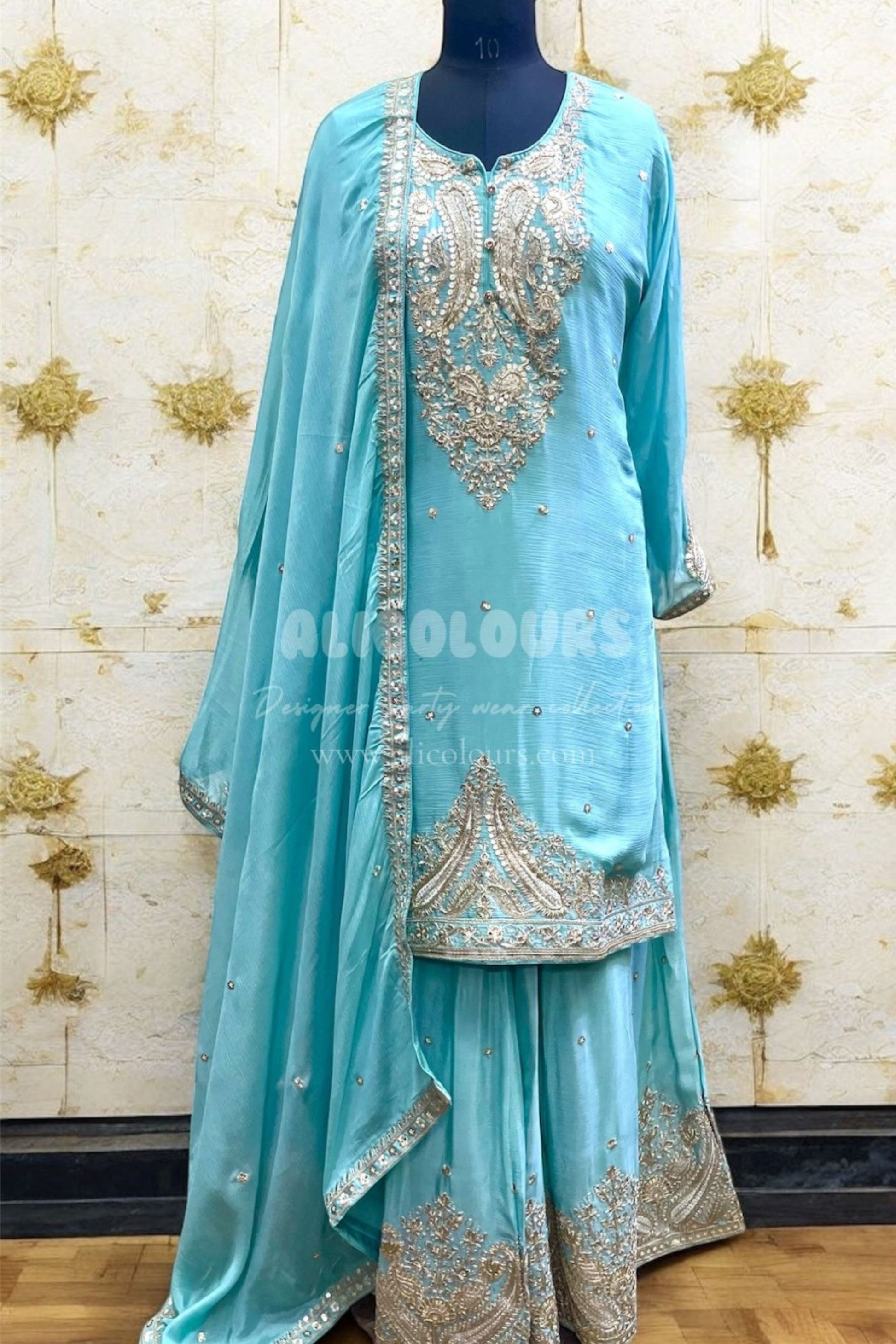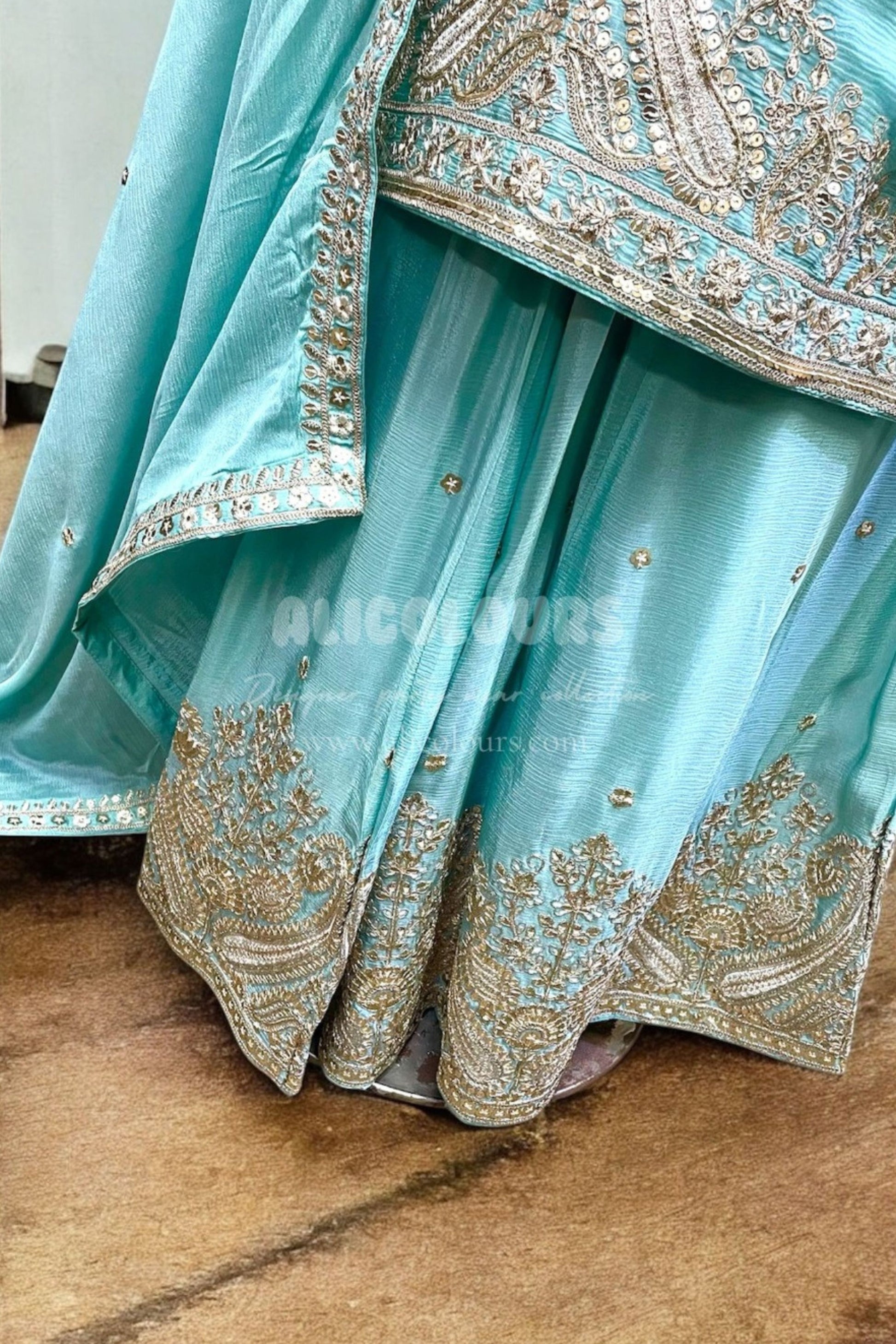 PASTEL BLUE DESIGNER HEAVY EMBROIDERED STITCHED SHARARA SUIT