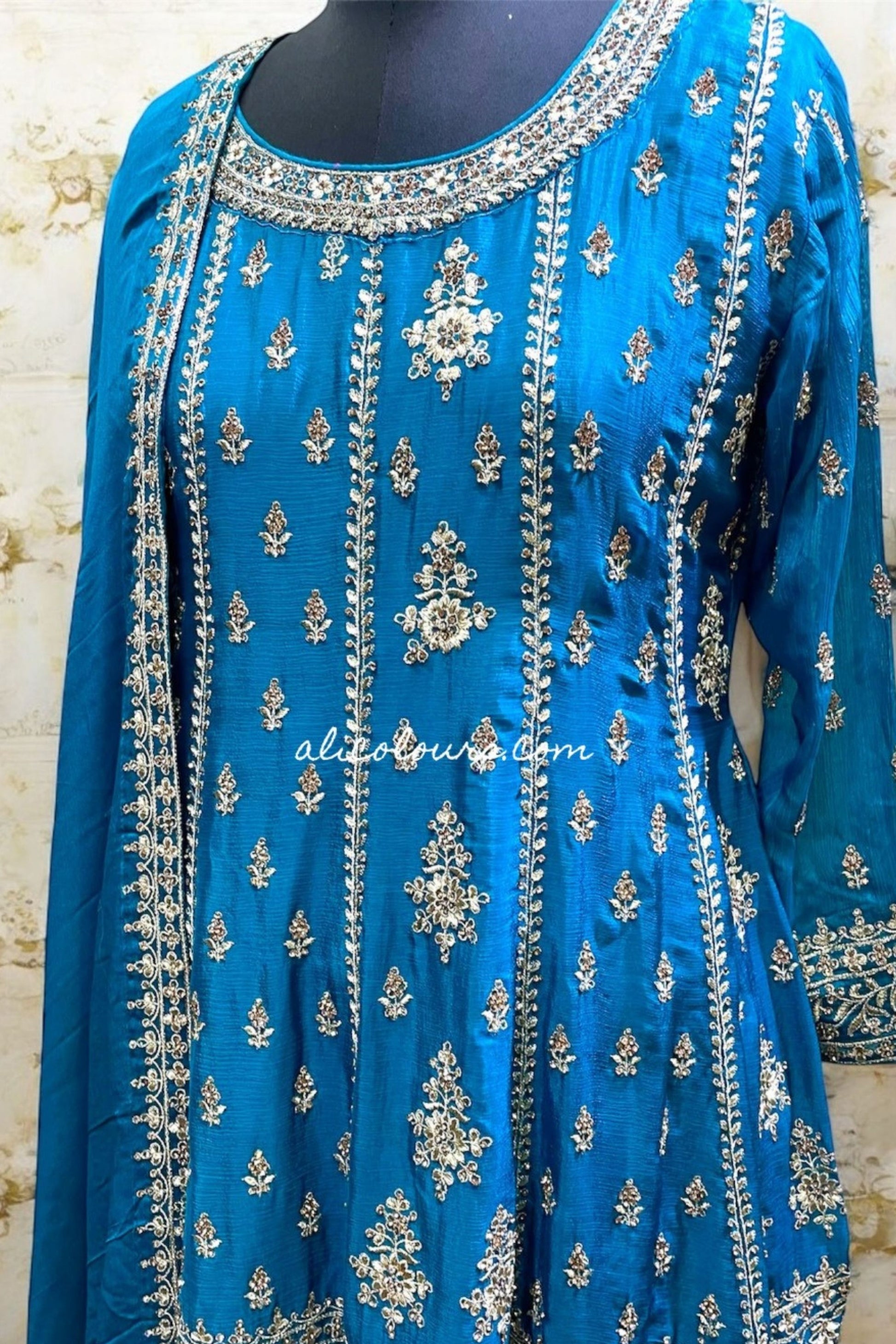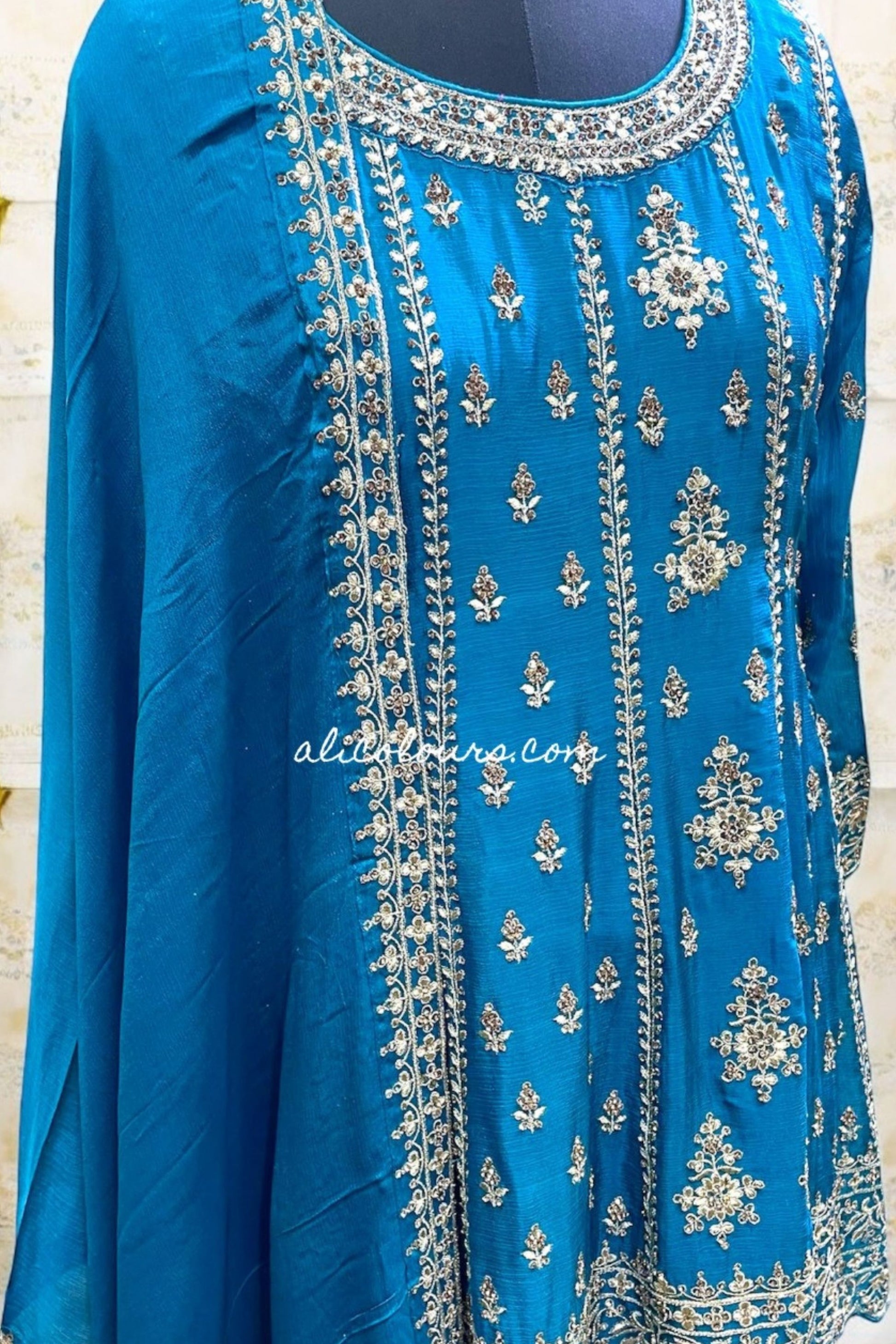 LUXURIOUS TEAL BLUE FULLY EMBROIDERED STITCHED GHARARA SET