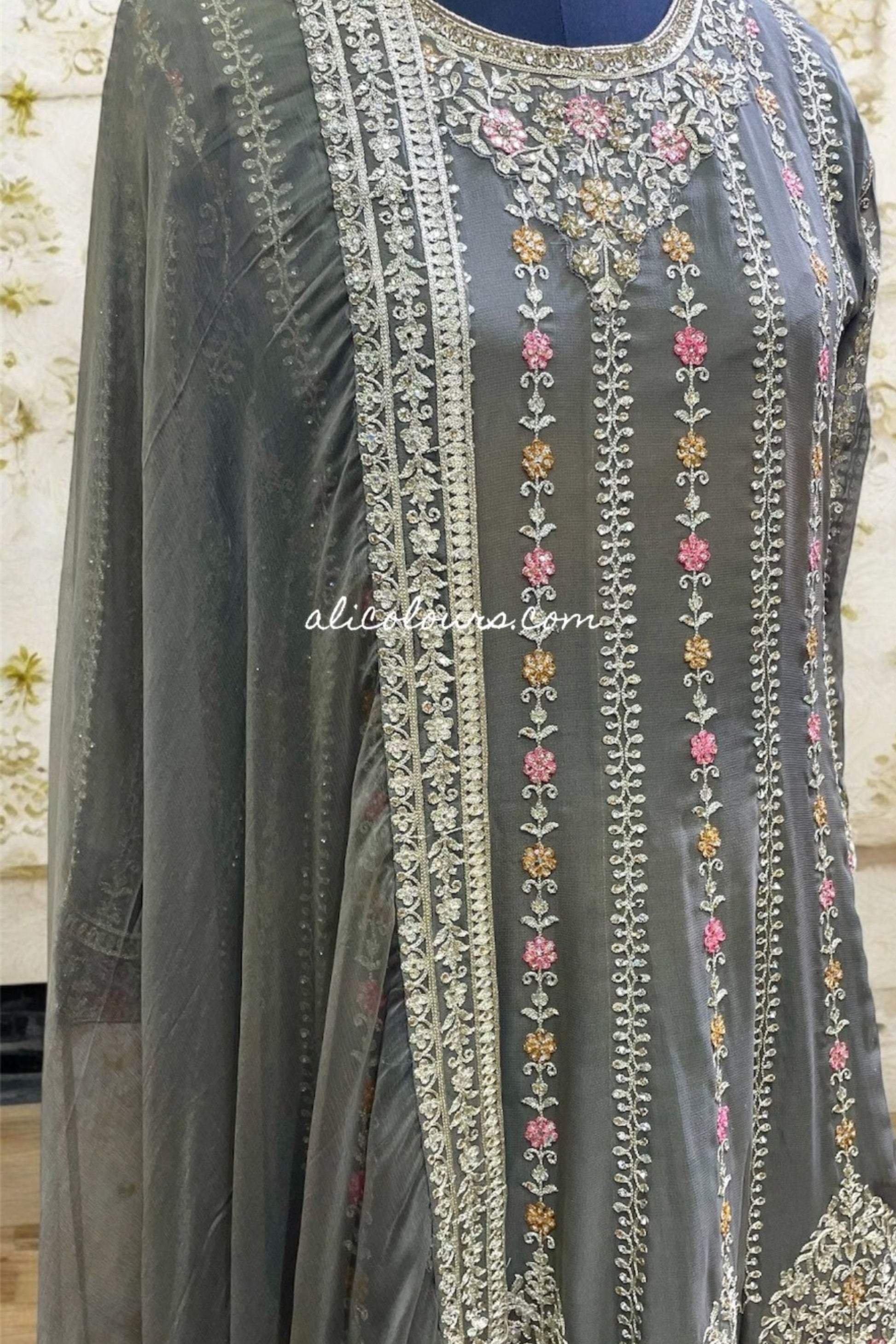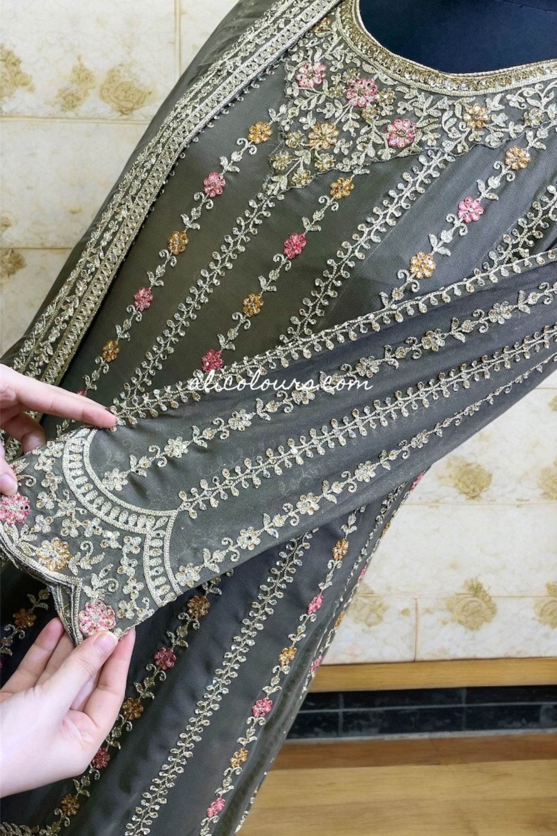 FULLY EMBROIDERED STITCHED BONSAI GREEN LONG GHARARA SET