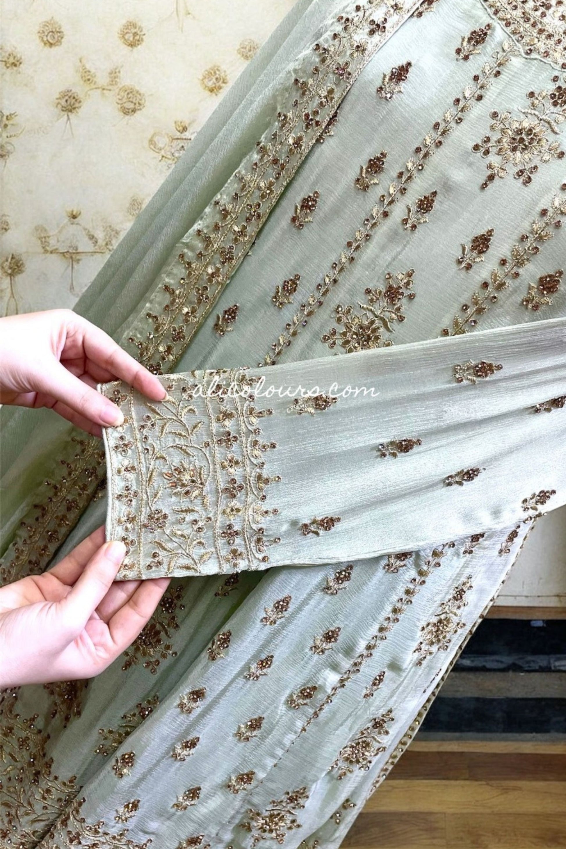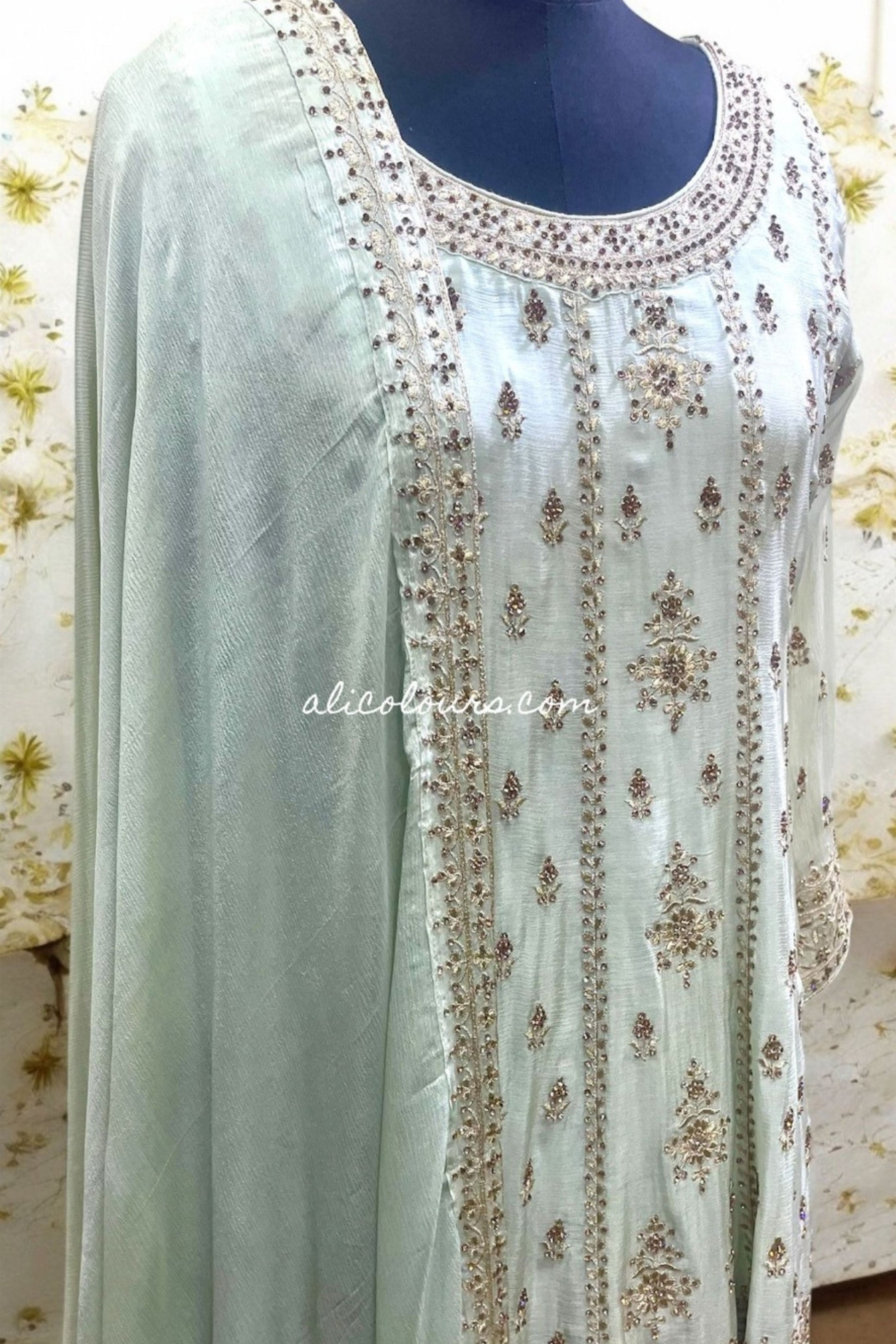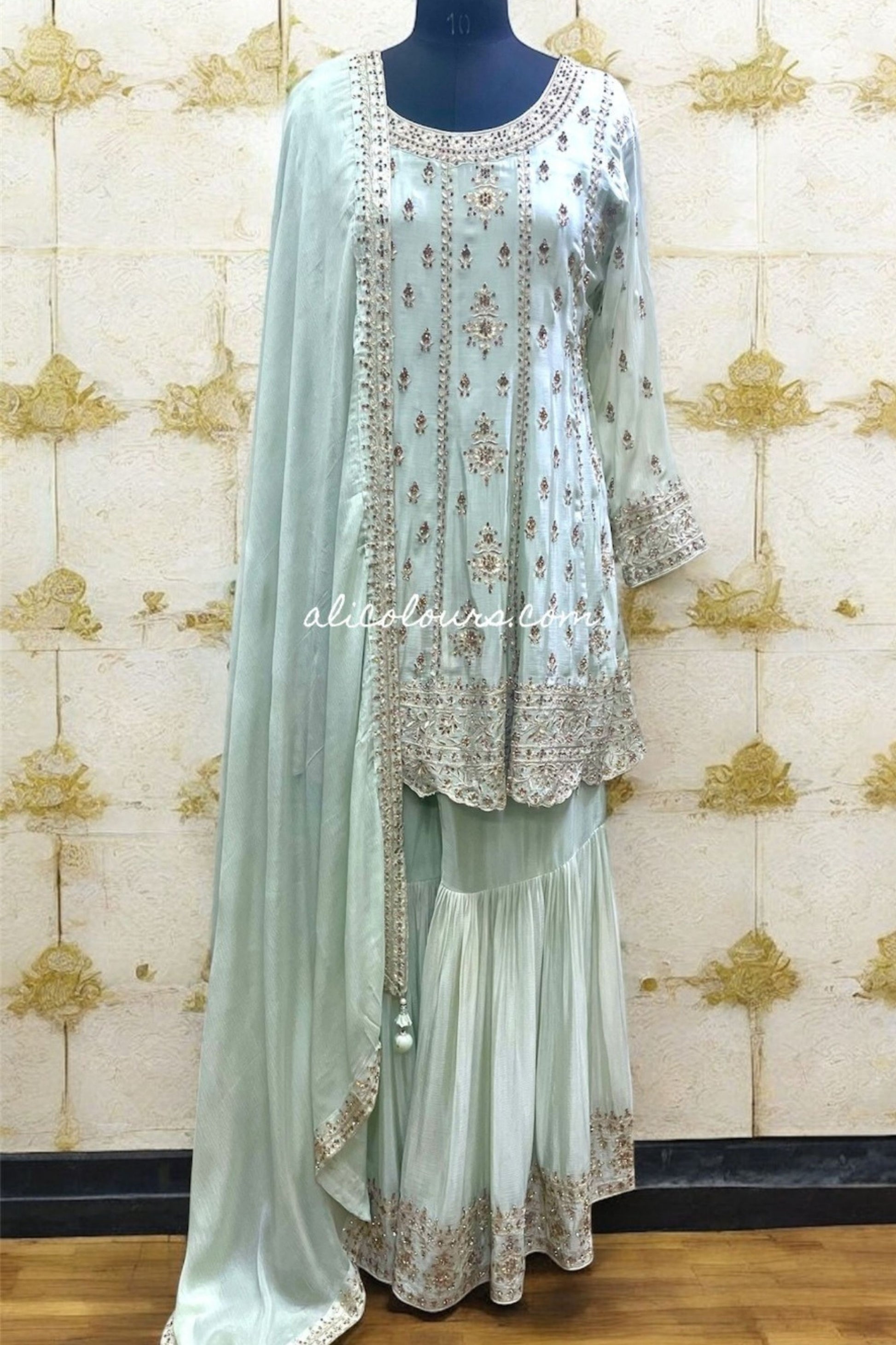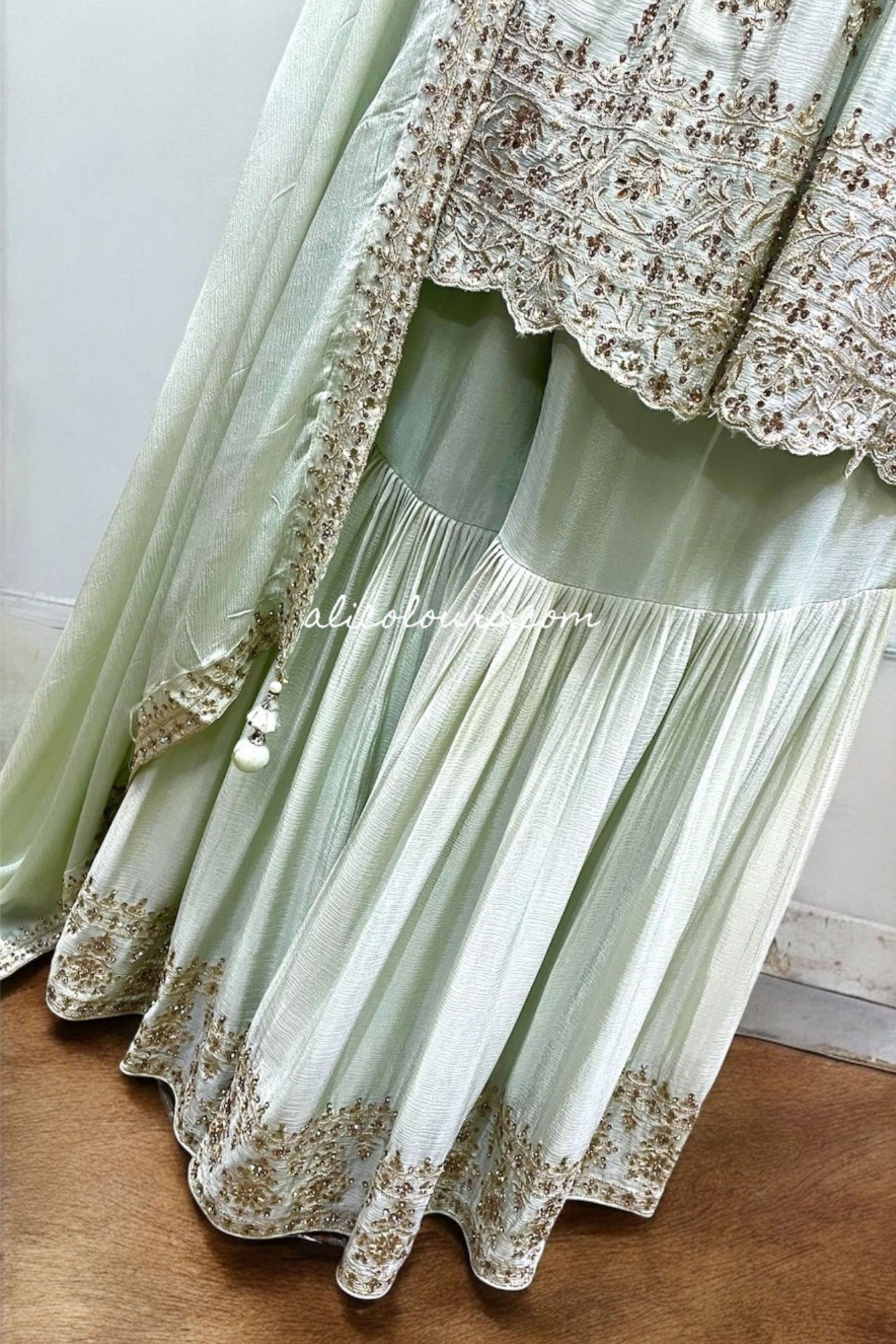 LUXURIOUS MINT GREEN FULLY EMBROIDERED STITCHED GHARARA SET