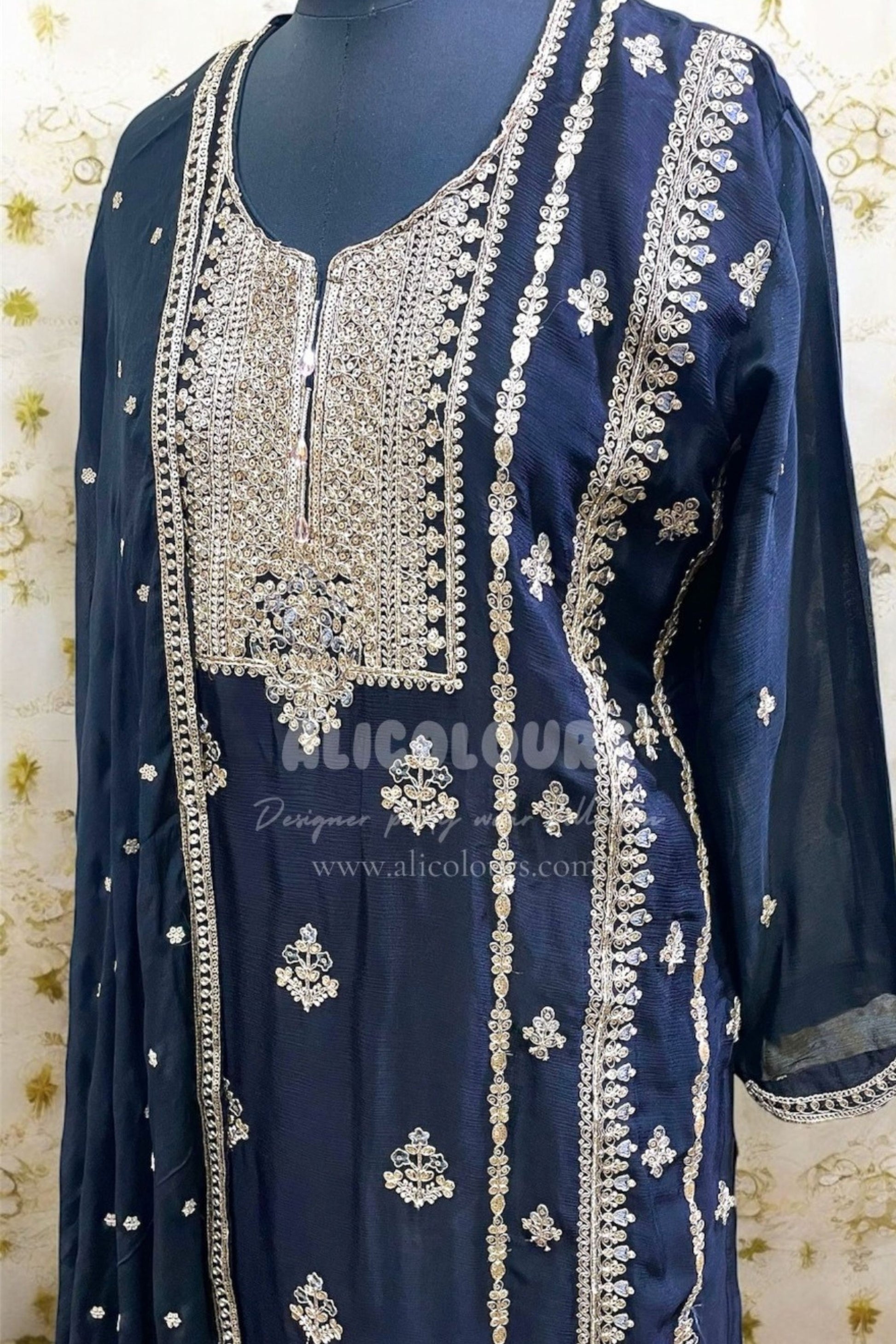 Dupatta : Fully Embroidered Chinon Dupatta with Heavy Hand Work with 4 sided Tassels Dupatta. LENGTH = 2.50 METERS.