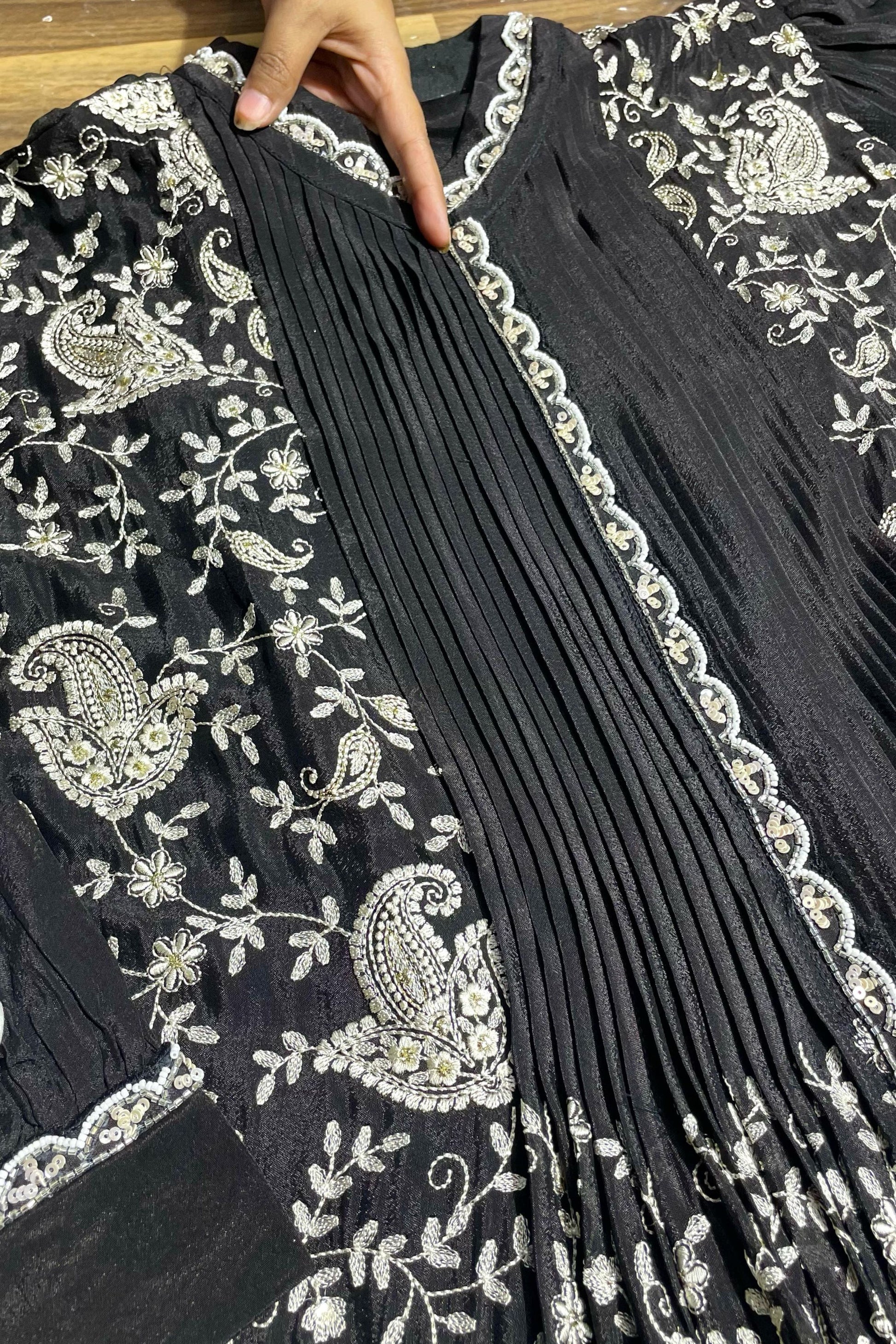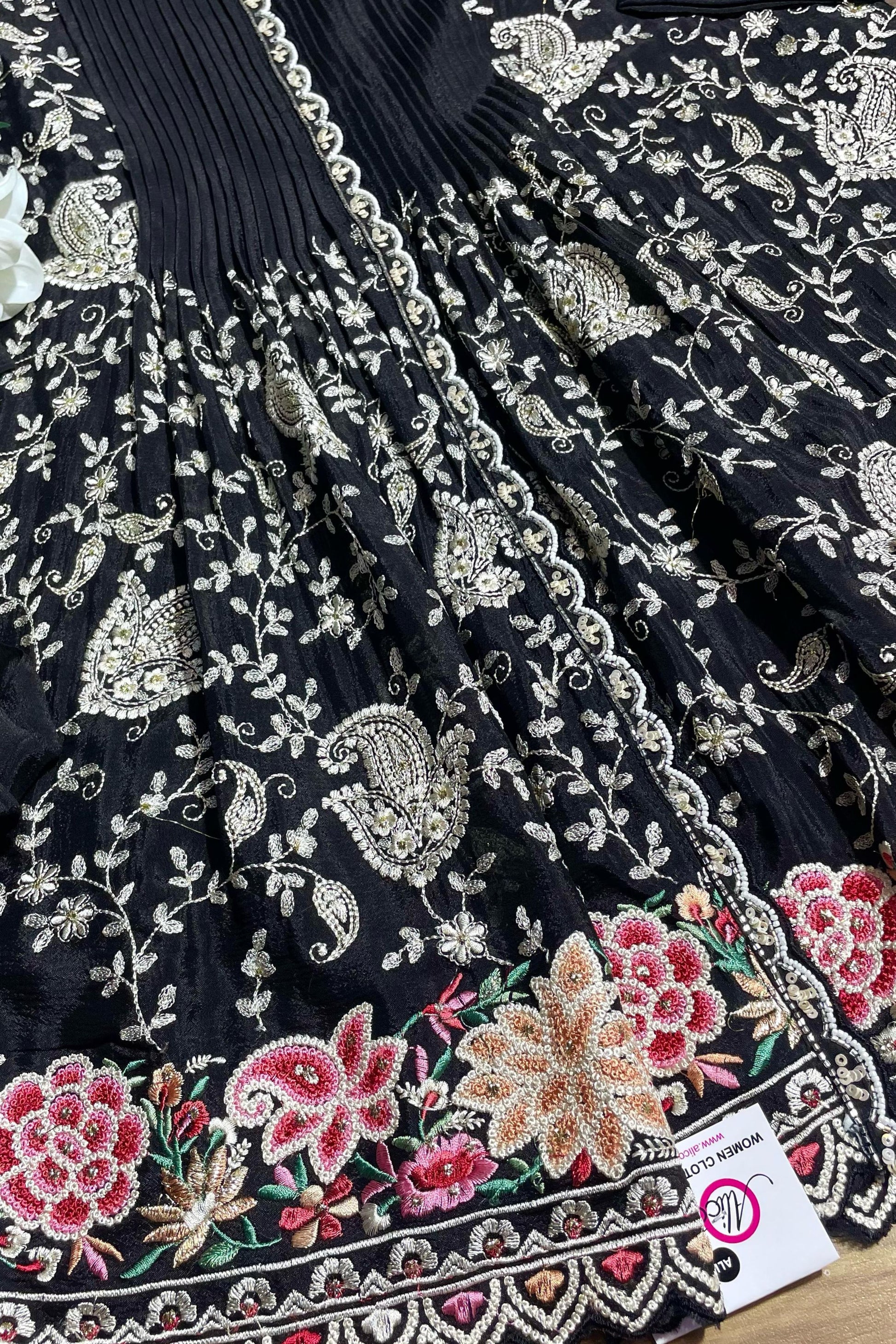 Top: Embroidered Neck with Cutdana and Resham Work Embroidery Sleeves Chinon shirt Bottom : Fully Embroidered Chinon Bottom Wear.