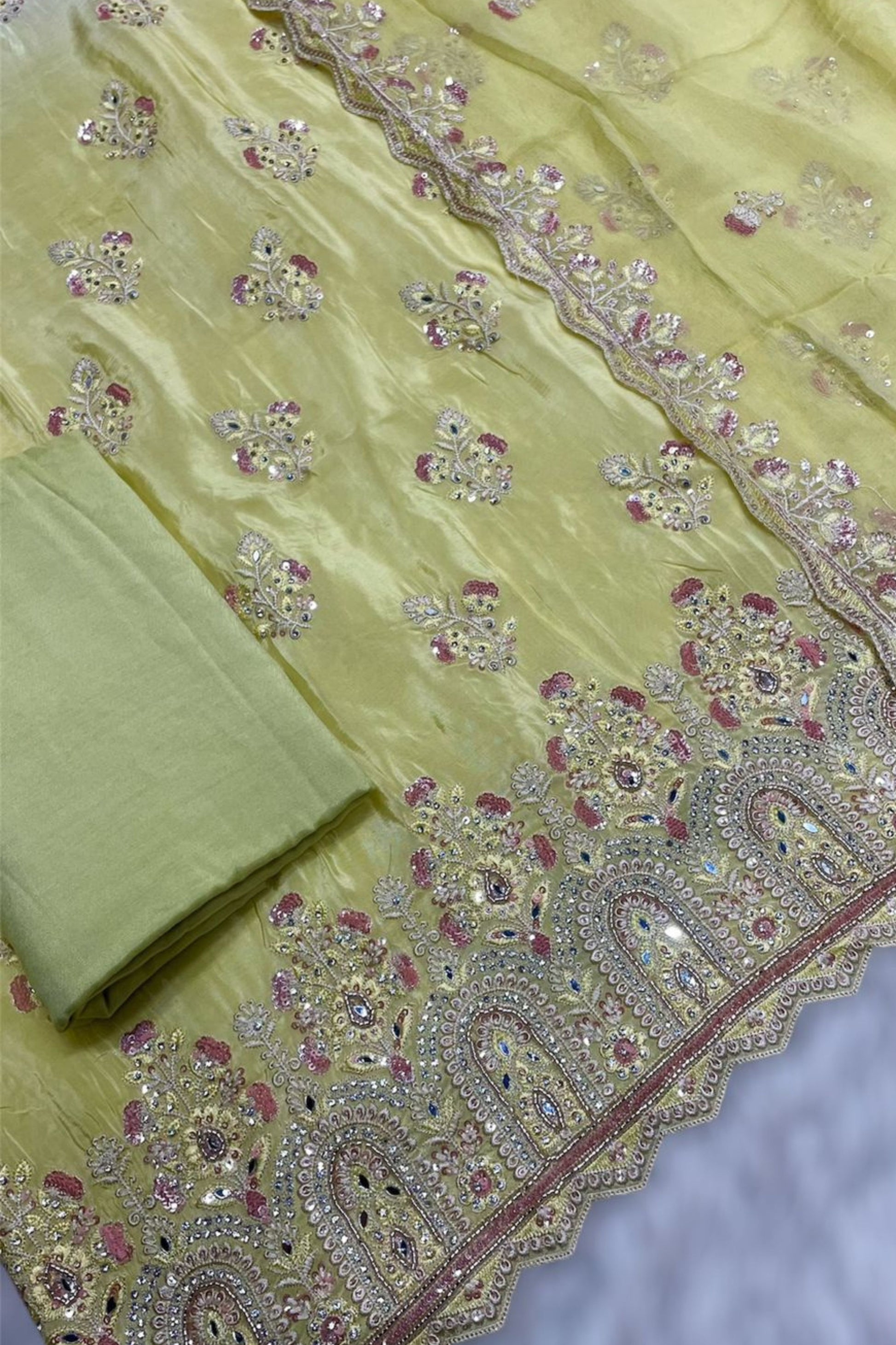 Dupatta: Lightweight chiffon with subtle embellishments, adding a flowy and refined touch to your outfit.