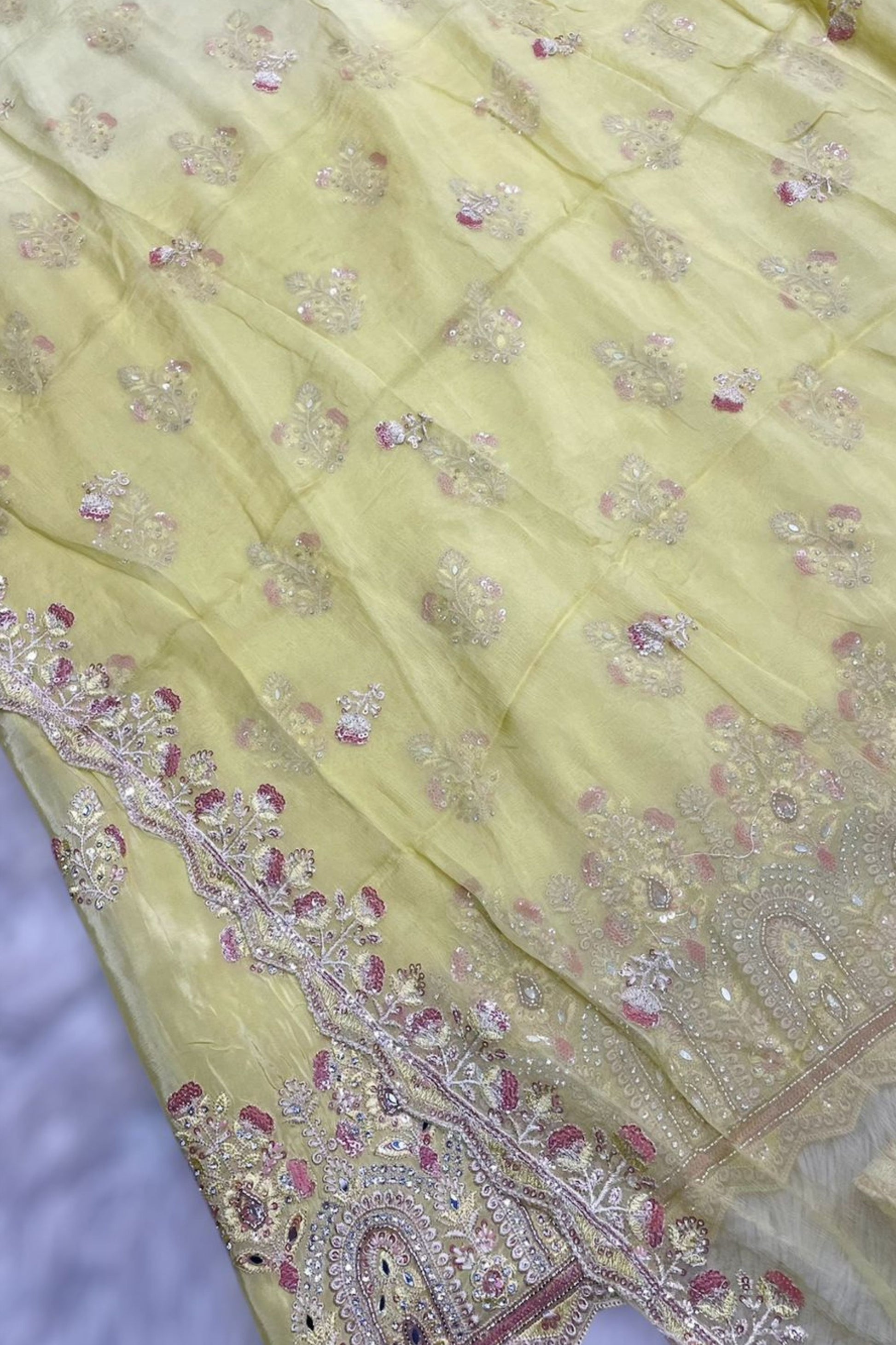 Top : Soft crepe fabric adorned with delicate handwork, offering a sophisticated and graceful look.