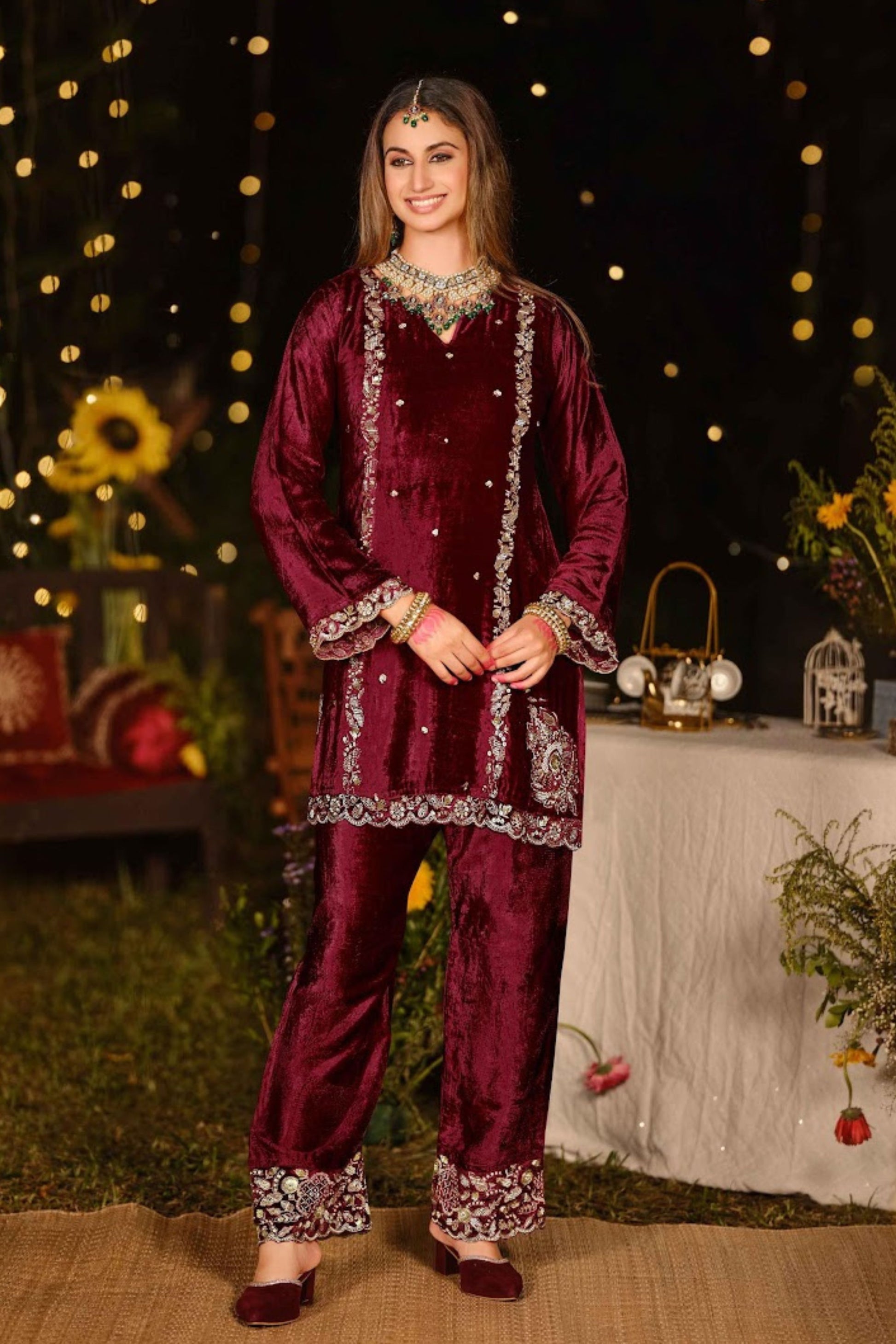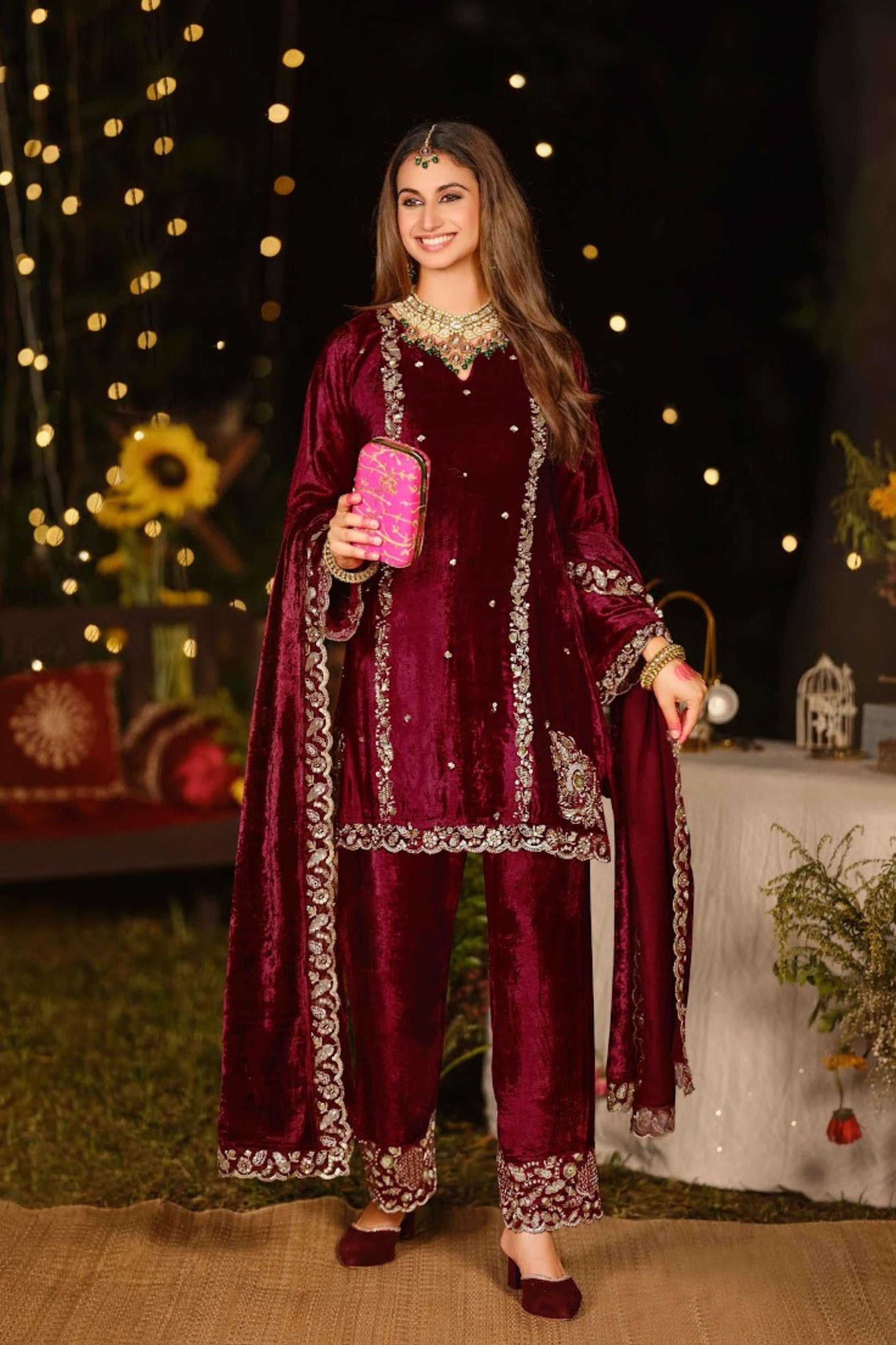 Top : Pure Viscose Velvet With Designer Handmade Embroidered On Front ,Back, Sleeves and Daaman