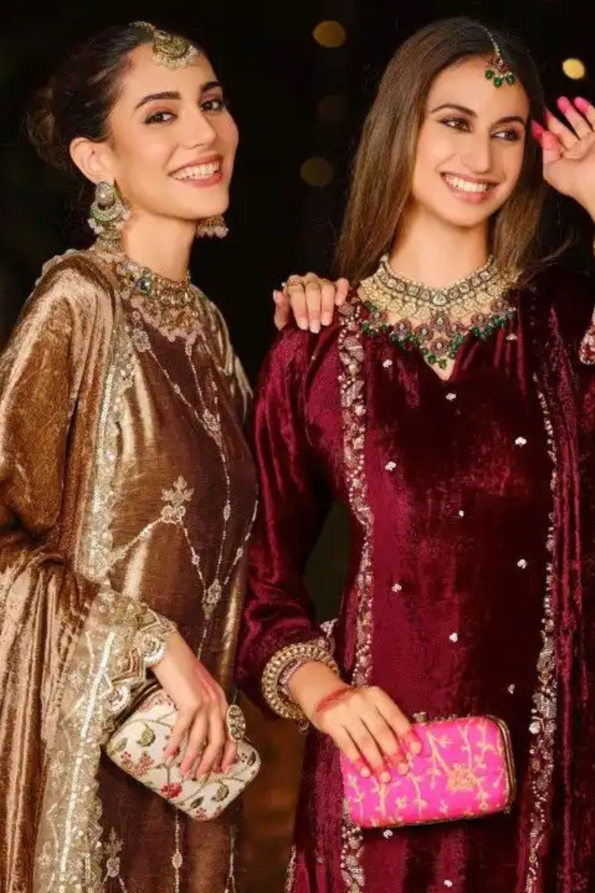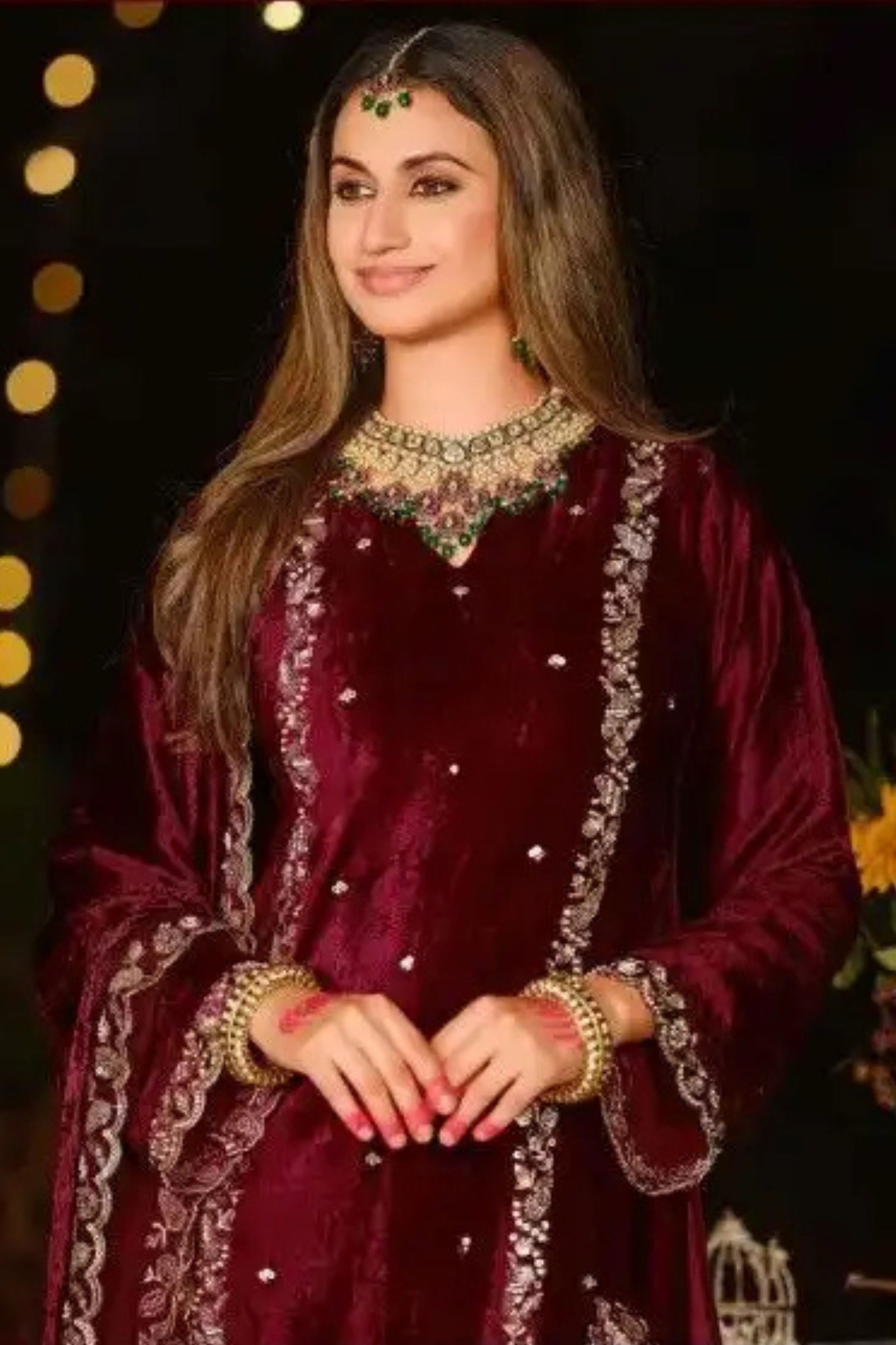 Top : Pure Viscose Velvet with Designer Handmade Embroidered on Front, Back, Sleeves & Daaman