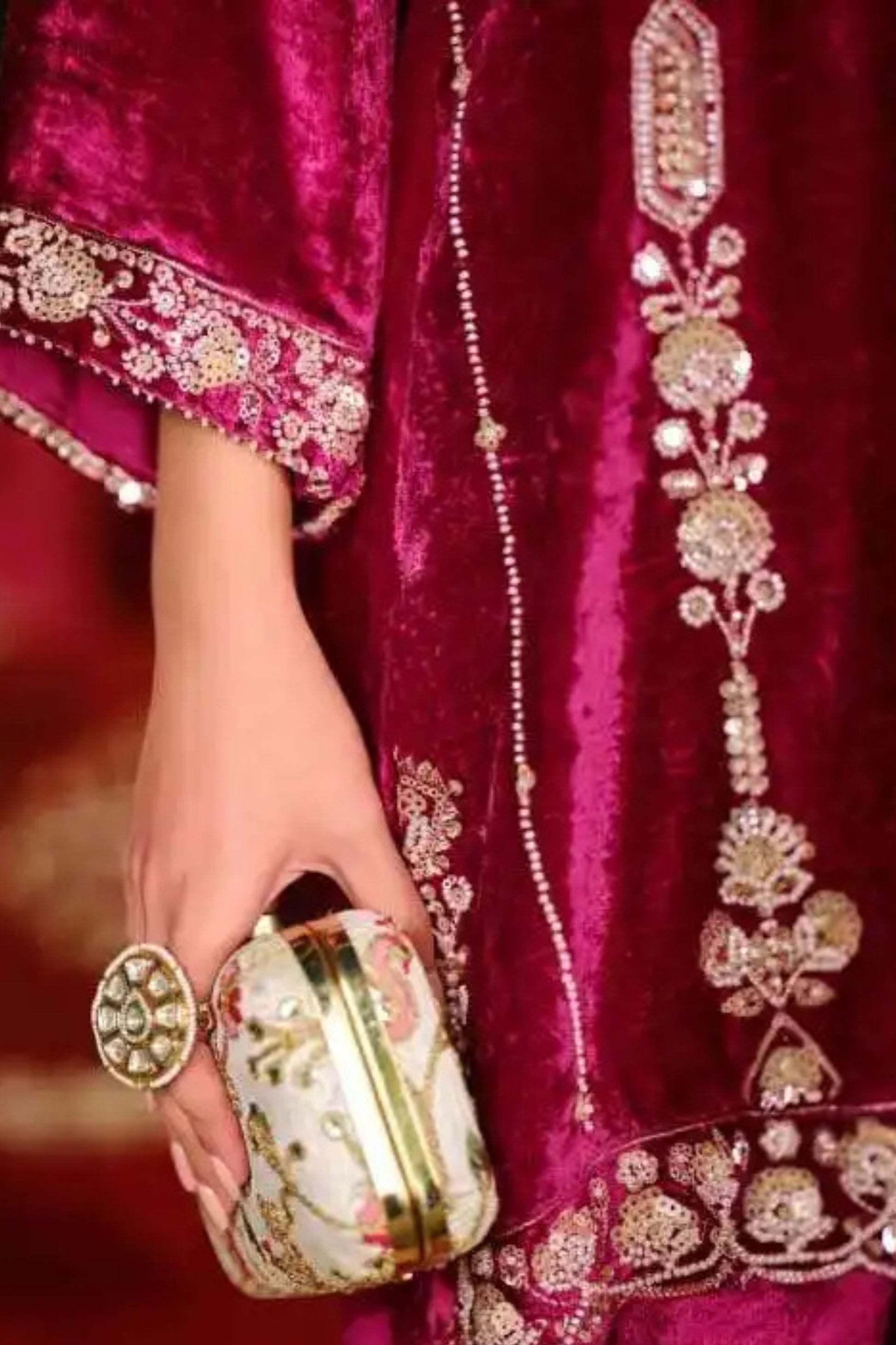 Top : Pure Viscose Velvet with Designer Handmade Embroidered on Front, Back, Sleeves & Daaman